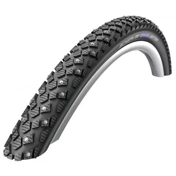 Conçu pour rouler sur les routes asphaltées comme sur les chemins par conditions extrêmes, le pneu SCHWALBE Marathon Winter Plus 700 x 35c offre une maîtrise parfaite sur la glace et la neige, y compris dans les virages serrés ou lors de freinages violents, grâce à 240 clous répartis tout le long de la bande de roulement.