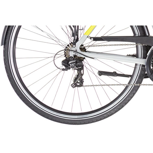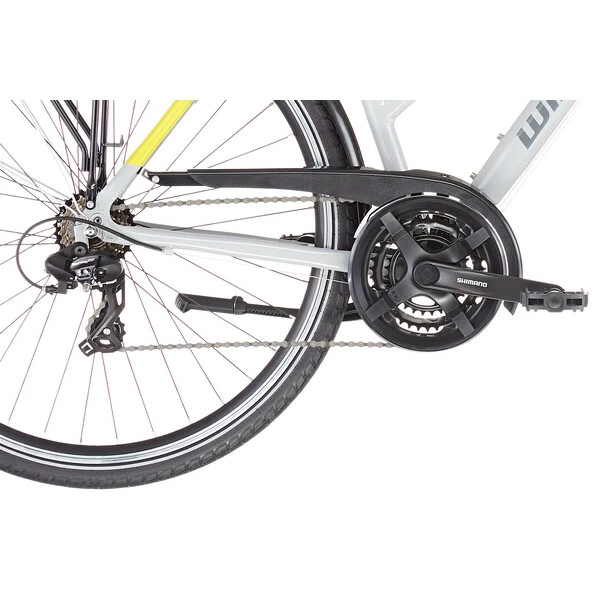 Les composants ont été selectionnés dans une optique de solidité et de fiabilité, notamment avec une transmission Shimano Tourney 3×7 vitesses procurant une grande polyvalence.