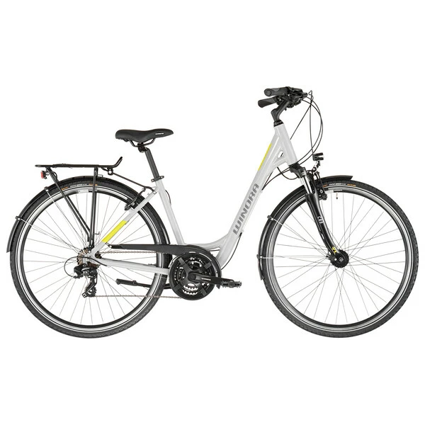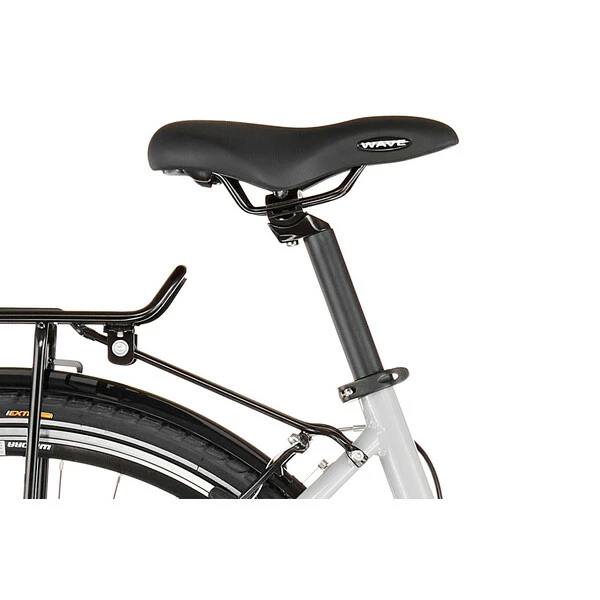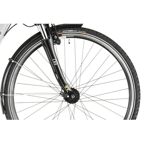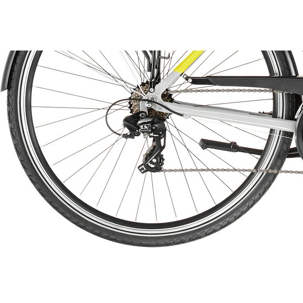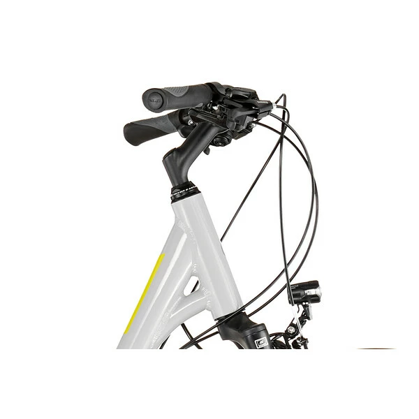 Conçu autour d’un cadre en aluminium 6061 robuste et confortable assurant une position agréable pour la longue distance, il reçoit en plus une fourche suspendue avec ressort en acier offrant 40 mm de débattement afin d’absorber les irrégularités de la route et des sentiers. Avec ses jantes double paroi et ses pneus larges, il pourra en effet s’aventurer sur les chemins de traverse.