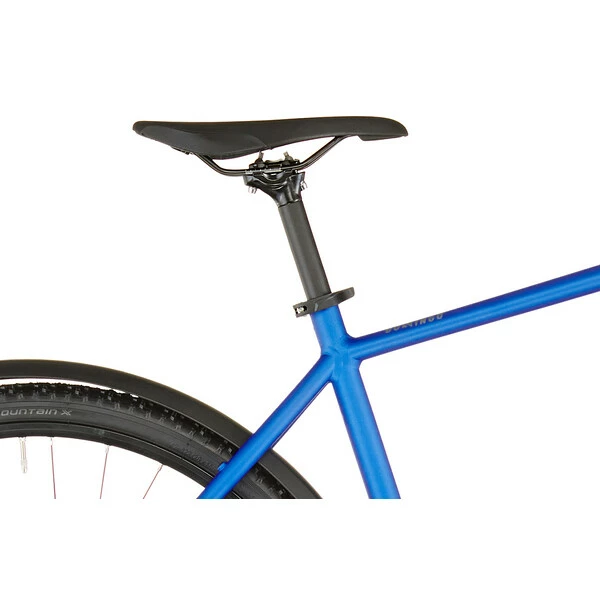 Conçu autour d’un cadre en aluminium 6061 robuste et confortable assurant une position agréable pour la longue distance, il reçoit en plus une fourche suspendue avec ressort en acier offrant 63 mm de débattement afin d’absorber les irrégularités de la route et des sentiers. Avec ses jantes double paroi et ses pneus larges, il pourra en effet s’aventurer sur les chemins de traverse.