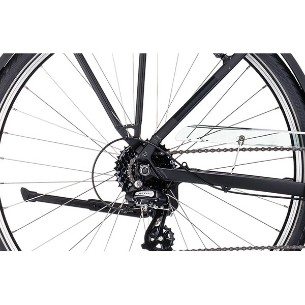 Il combine un cadre aluminium à géométrie trapez et un équipement fiable et efficace. Il reçoit ainsi une transmission Shimano Altus 3×8 vitesses permettant de passer partout avec sérénité, des freins V-brake efficaces, ou encore une fourche suspendue SR Suntour absorbant les vibrations etamortissant les chocs.