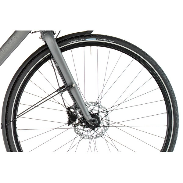 Le reste de l’équipement est à la hauteur, avec des pneus Schwalbe Marathon Racer surmonté de bandes réfléchissantes, des poignées ergonomiques, un porte-bagages arrière, des garde-boues et un jeu d’éclairage sur moyeu dynamo délivrant 70 Lux à l’avant.