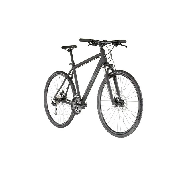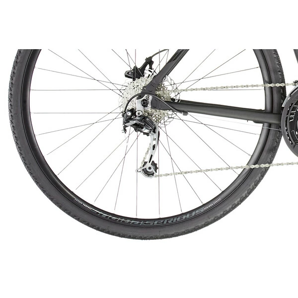 Un vélo robuste et armé pour les terrains difficiles, à l’image des jantes aluminium à double paroi et des pneus Schwalbe CX Comp de 40 mm.